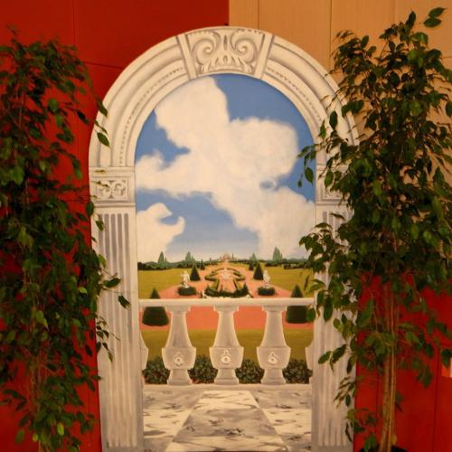 Arche en pierre avec deux anges accrochés autour tenant un ruban fleuri; donnant sur vue de terrasse puis de jardin à la française :