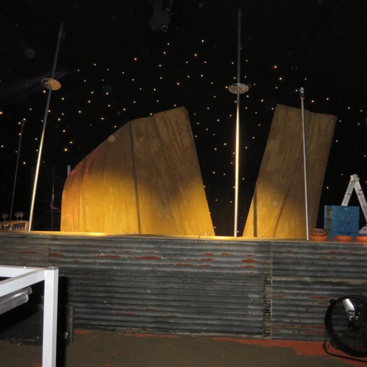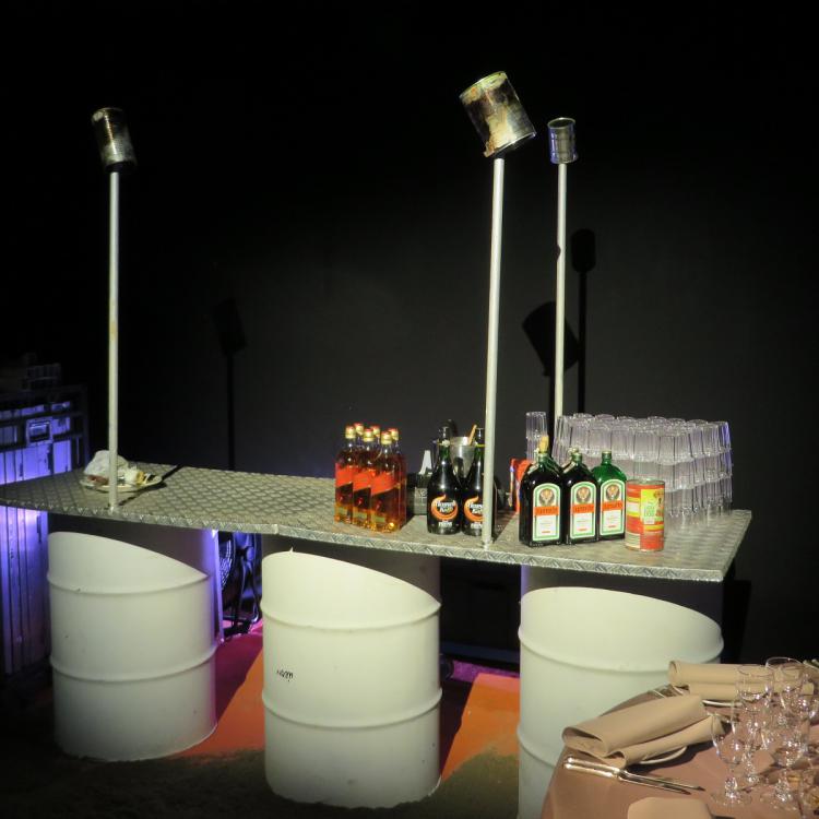 Bar 3 m l. x 1 m 20 ht. pour 1/2 buse rouillée en face avant enchâssée dans une armature, tablette noire 50 cm P :