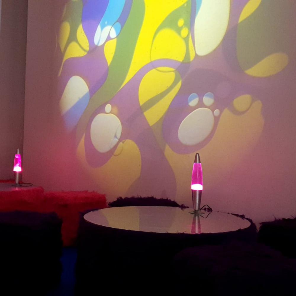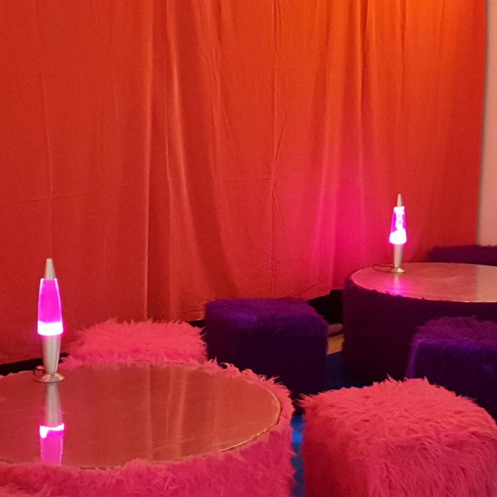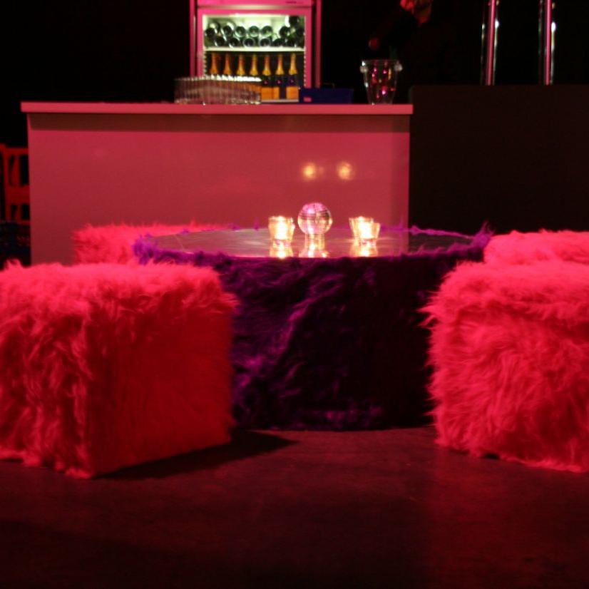 4 Podiums de danse cubique avec grille supérieure pour light & smoke 105 cm de côté recouverts de fourrure longs poils; 2 rose, 2 mauve :