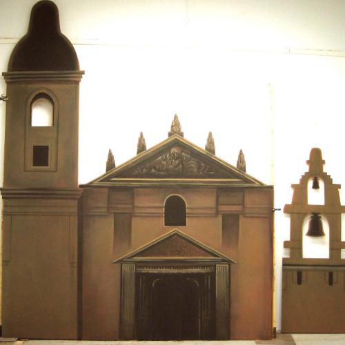 Eglise argentine avec tour et clochers peint sur pan. 2D 5 m ht. x 5 m l :