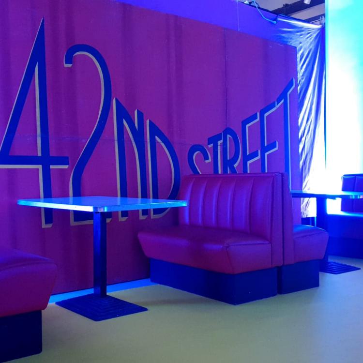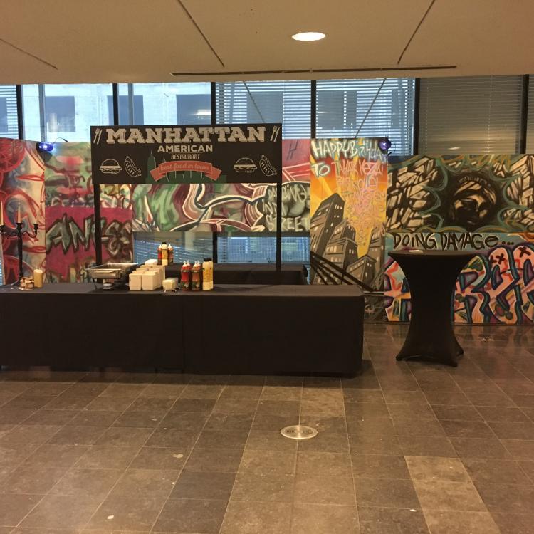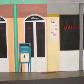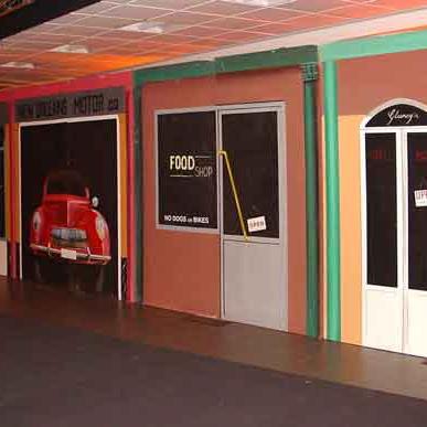 Façades de magasins new-yorkais peintes sur panneaux 2 D, 2 m 40 de haut s./30 m/lin :