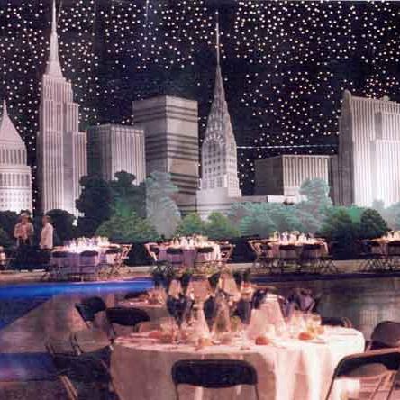 10 Buildings de 4,20 à 7 m de haut peints 3 tons de gris sur panneaux en 2 D 2 plans; +/- 25 m/linéaires placés :