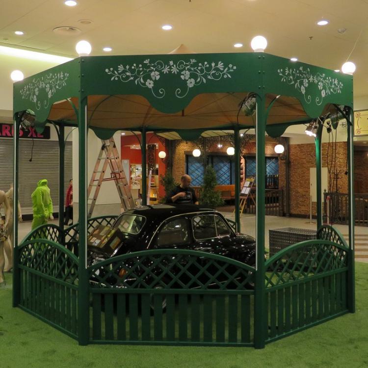 Kiosque à musique octogonal 5 m de D. et 3 m 50 ht. bois peint vert et blanc, avec 8 boules lumineuses en périphérie :
