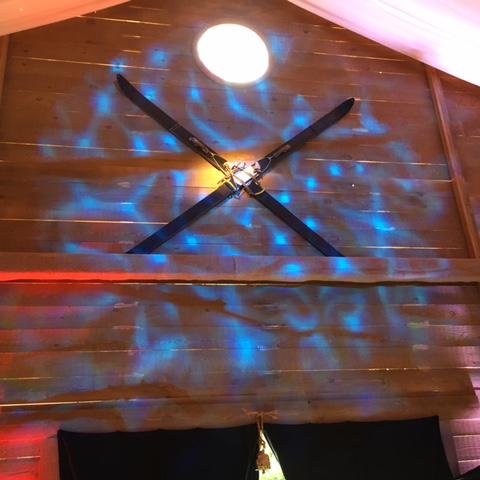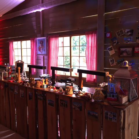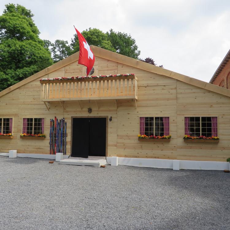 Façade de Chalet suisse (14,60 m x 2,62 m ht. côtés et 5,37 m au faîte) avec 4 fenêtres et ouverture centrale 2 x 2 m, étage, balcon et