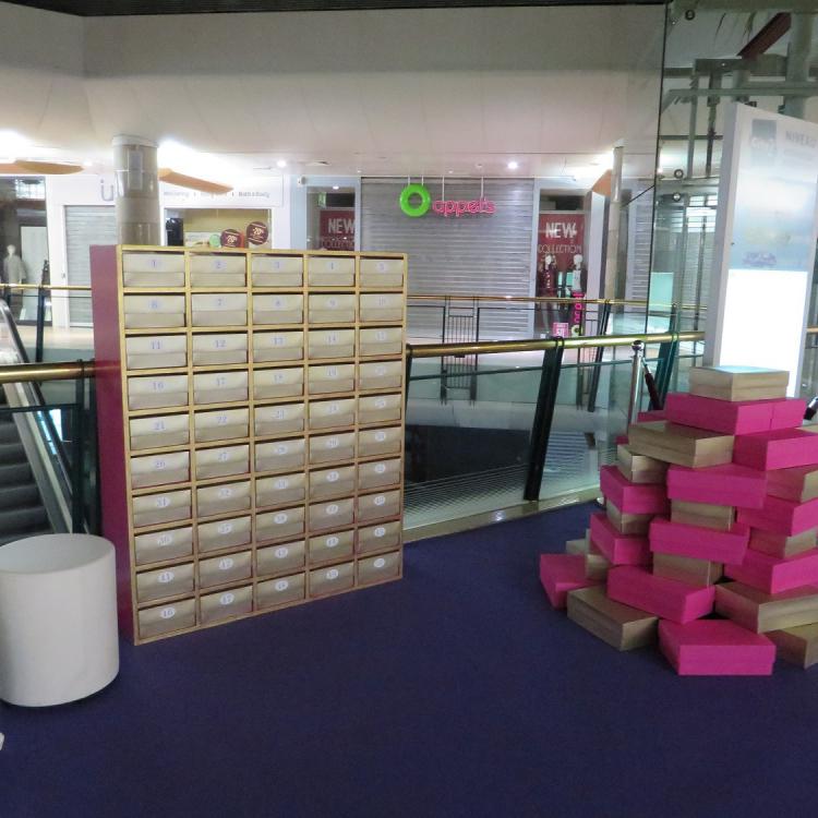 Etagère magenta et tranches dorées à 50 casiers sans fond, contenant 50 boîtes dorées (rouge int.) numérotées, pour tirage au sort...