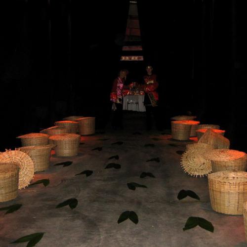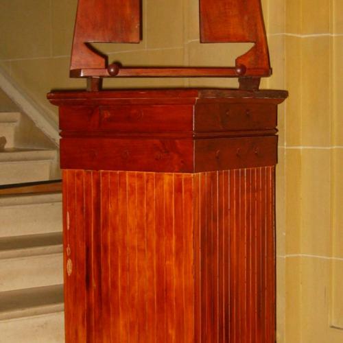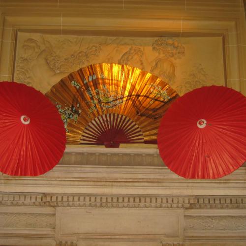 Encensoir rouge et or sur table avec 4 bras pour porteurs Dim : 46 D. x 85 ht Table : 70 x 70 x 50 ht Bras : 80 lg.