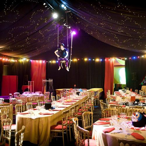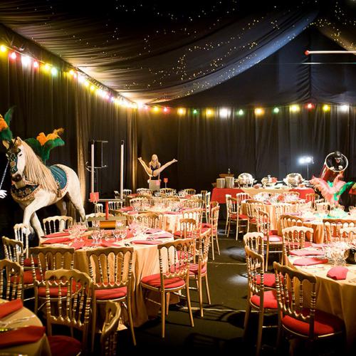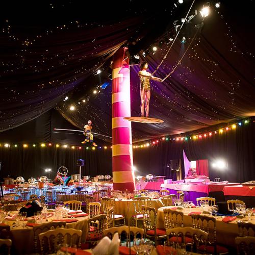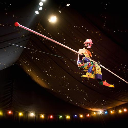 17 Milieux de table : Natures mortes thématiques illustrant 15 artistes de cirque au moyen de miniatures, maquettes ou accessoires : Jongleur, trapéziste, écuyère, dompteur, dresseur, homme canon, fakir, clowns, magicien, monsieur loyal, équilibriste, funambule...